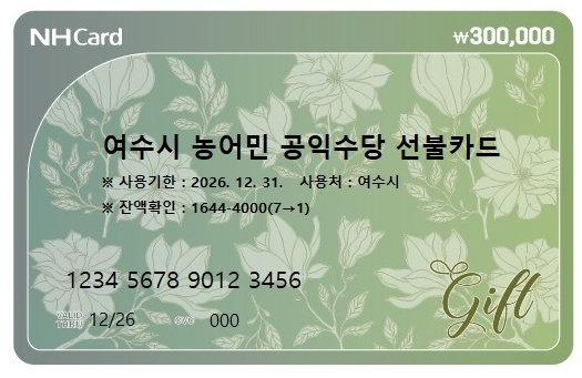 [무한뉴스=정민정 기자] 여수시는 2026년부터 농어민 공익수당 지급방식을 기존 ‘여수사랑상품권(지류형)’에서 ‘선불카드’로 전환한다고 밝혔다.
