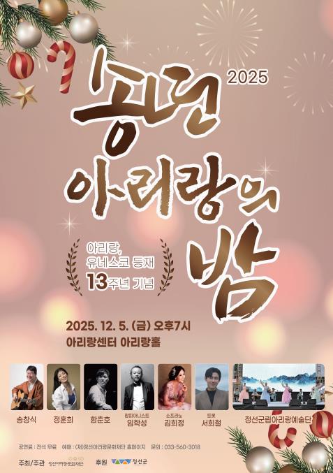 군은 이번 행사를 통해 아리랑의 국제적 위상과 지역 문화의 정체성을 재조명하고, 군민과 함께 따뜻한 연말 분위기를 나누는 의미 있는 시간이 될 것으로 기대하고 있다.