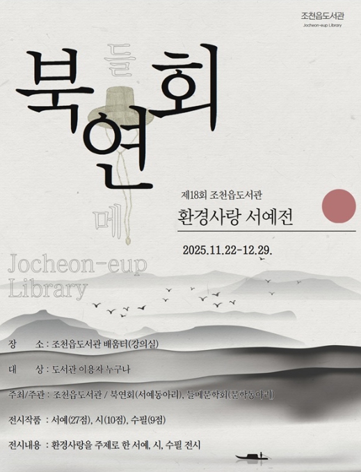 [무한뉴스=정민정 기자] 제주시 조천읍도서관은 11월 22일부터 12월 27일까지 도서관 1층 배움터에서 ‘제18회 환경사랑 서예전’을 개최한다.