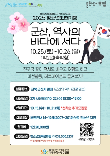 [무한뉴스=정승훈 기자] 부평구 청소년수련관은 오는 21일까지 ‘2025 청소년 또래기행 - 군산, 역사의 바다에 서다’에 참가할 청소년을 모집한다.