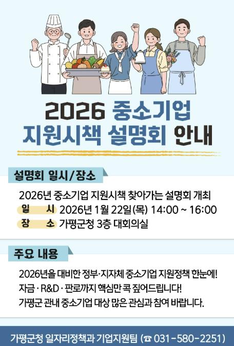 [무한뉴스=정승훈 기자] 가평군이 관내 중소기업의 경영 안정과 경쟁력 강화를 위해 새해 정부의 지원시책을 한자리에 모아 안내하는 설명회를 연다.