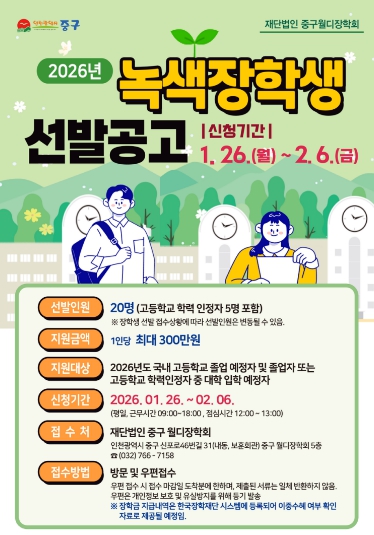 [무한뉴스=정승훈 기자] 재단법인 인천 중구월디장학회(이사장 김정헌)는 지역 인재 육성을 위해 ‘2026년도 녹색 장학생’ 대상자를 모집한다고 20일 밝혔다.