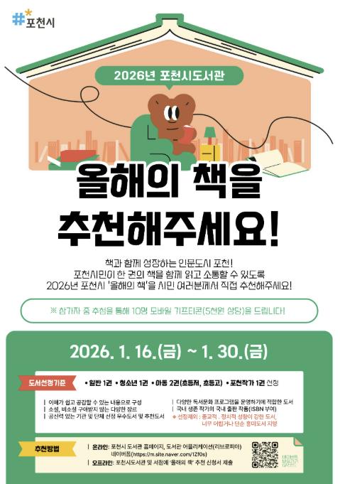 [무한뉴스=정승훈 기자] 포천시는 ‘2026년 포천시 올해의 책’ 선정을 위해 오는 16일부터 30일까지 시민 투표를 진행한다.