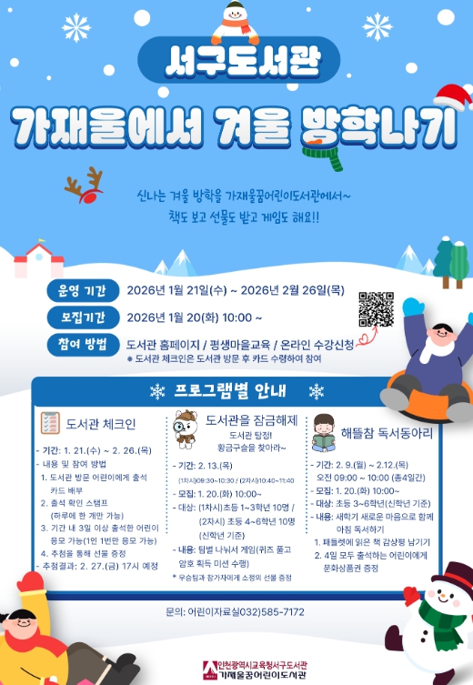 [무한뉴스=정승훈 기자] 인천광역시교육청서구도서관은 겨울방학을 맞이한 어린이들이 도서관에서 특별하고 즐거운 경험을 쌓을 수 있는 '가재울에서 겨울 방학나기'를 21일부터 운영한다.