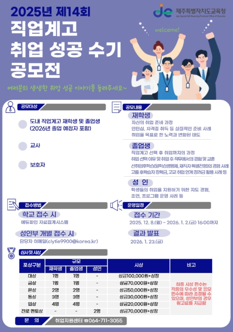 [무한뉴스=정승훈 기자] 제주특별자치도교육청은 고졸 취업 성공 문화를 확산하고 직업계고에 대한 긍정적 인식을 높이기 위해‘제14회 직업계고 취업 성공 수기 공모전’을 8일부터 내년 1월 2일까지 개최한다.
