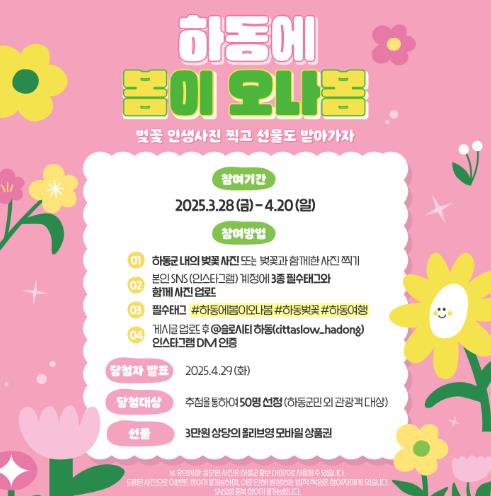 ‘하동에 봄이 오나봄’은 오는 4월 20일까지 진행되며, 낭만이 넘치는 이벤트에 참여하고 싶다면 하동의 벚꽃 명소에서 찍은 사진을 자신의 SNS 계정에 올린 후, 슬로시티하동 인스타그램 DM으로 인증하면 된다.