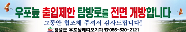 창녕군은 우포늪 AI 확산 방지를 위해 지난달 16일부터 시행된 우포늪 탐방로 출입 제한 조치에 대해 우포늪 인근에 3주 이상 고병원성 AI 추가 발생이 없고, 창녕 고병원성 AI 발생 예찰지역 내 가축 이동 제한 해제 상황을 감안해 우포늪 출입 제한 탐방로를 전면 개방하기로 결정했다.