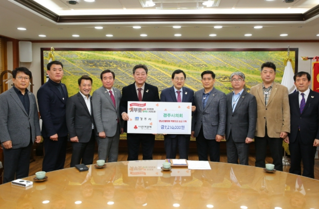 ▲ 경주시의회가 지난달 31일 경북사회복지공동모금회에 영남권 산불피해 성금 721만 원을 전달한 뒤 기념촬영을 하고 있다. |