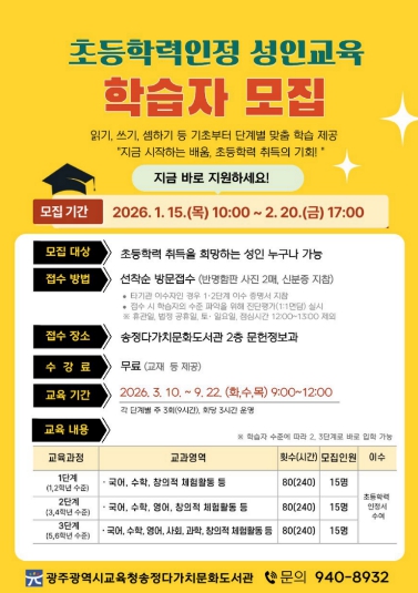[무한뉴스=정민정 기자] 광주시교육청송정다가치문화도서관은 ‘2026학년도 초등학력인정 성인교육’ 프로그램을 운영한다.