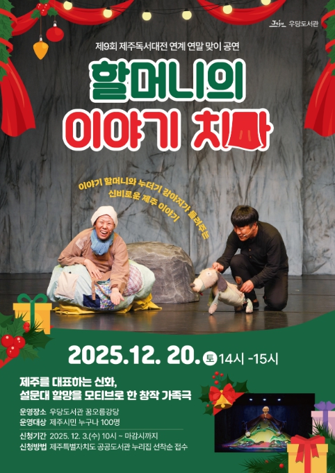 [무한뉴스=정민정 기자] 제주시 우당도서관은 연말을 맞아 12월 20일 오후 2시 연극 ‘할머니의 이야기 치마’ 공연을 개최한다.