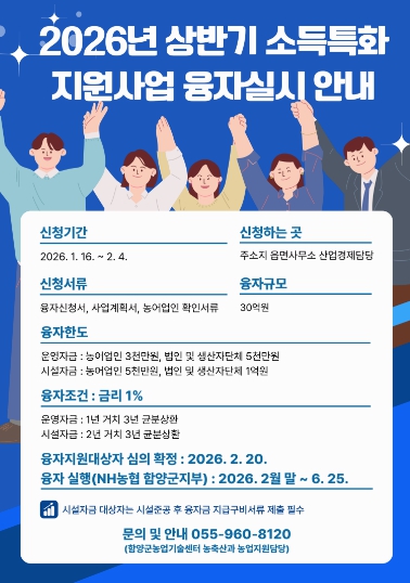 [무한뉴스=최진수 기자] 함양군은 농업인의 경영개선과 농업 경쟁력 강화를 위한 ‘2026년 상반기 소득특화지원사업’을 시행하고, 오는 2월 4일까지 융자신청을 받는다.