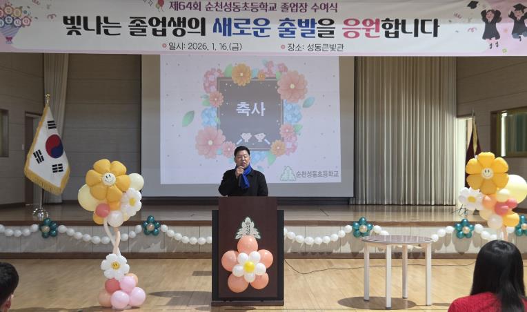 김 위원장은 “졸업생 여러분은 성동초등학교에서 지식뿐 아니라 친구와 함께하는 기쁨, 서로를 존중하고 배려하는 마음을 배워 왔다”라며, “그동안 쌓아 온 따뜻한 인성과 바른 태도는 앞으로 어떤 길을 선택하더라도 여러분을 든든히 지켜 줄 소중한 힘이 될 것”이라고 강조했다.