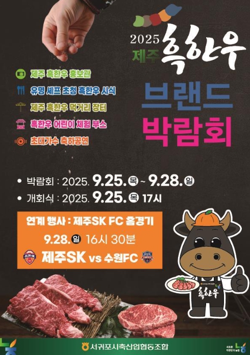 [무한뉴스=정민정 기자] 서귀포시는 추석 명절을 앞두고 제주 흑한우의 가치를 널리 알리고, 소비촉진을 통해 지역 축산업과 경제 활성화에 기여하고자 오는 9월 25일부터 9월 28일까지 4일간 제주월드컵경기장 광장에서 ‘2025 제주 흑한우 브랜드 박람회’를 개최한다고 밝혔다.