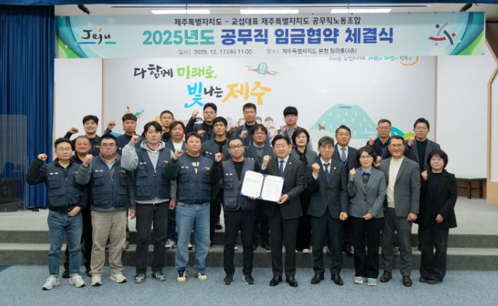 제주도와 교섭대표 노동조합인 제주도 공무직노동조합은 17일 오전 도청 탐라홀에서 ‘2025년도 공무직 임금협약’을 체결했다.