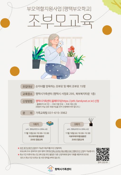 [무한뉴스=정승훈 기자] 평택시가족센터는 부모역할지원사업[평택부모학교]의 하나로 손주를 양육하는 조부모 및 예비 조부모를 대상으로 ‘조부모 교육’을 운영한다.
