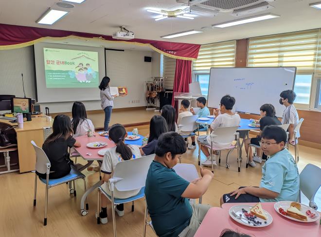 | ▲ 군내북초 학생들이 아침간편식을 먹으며 아침독서활동을 하고 있다. |