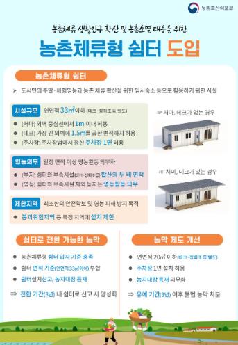 또한, 농촌 체류형 쉼터 설치 후 60일 이내에 가설건축물 축조 신고필증과 설치 현황을 농지소재지 읍면동 행정복지센터에 제출해 농지 대장에 등재해야 한다.
