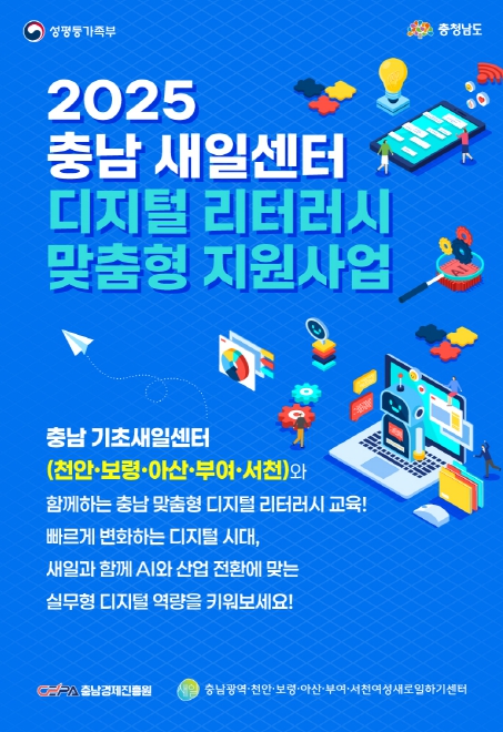 [무한뉴스=정민정 기자] 충남경제진흥원 내 충남광역여성새로일하기센터는 천안·보령·아산·부여·서천 등 도내 5개 기초새일센터와 함께 '2025 새일센터 디지털 리터러시 맞춤형 지원사업'을 본격적으로 추진한다고 밝혔다.
