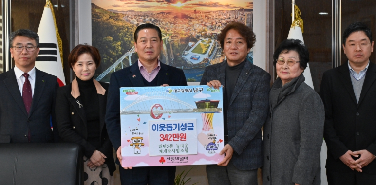 [무한뉴스=최진수 기자] 대구 남구는 대명3동 뉴타운 재개발사업 조합의 조합장(이대룡)을 비롯한 임원, 대의원 및 직원이 지난 2025년 12월 30일 연말을 맞아 어려운 이웃을 위해 써달라며 정성껏 모은 성금 342만원을 기탁했다고 밝혔다.