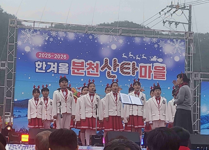[무한뉴스=최진수 기자] 봉화군 소천면 분천산타마을에서 지난 20일(토) 개최된 ‘2025 한겨울 분천산타마을 개장식’ 이 지역주민과 관광객들의 열띤 호응 속에 성황리에 열렸다. 이번 개장 축하공연에는 봉화교육지원청이 운영하는 봉꽃송이 청소년 합창단이 참여하여 한겨울 추위를 녹이는 따뜻한 무대를 선사했다.
