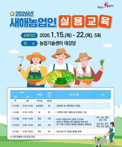 [무한뉴스=최진수 기자] 성주군은 오는 1월 15일부터 22일까지 농업기술센터 대강당에서 지역 농업인 350여명을 대상으로 '2026년 새해농업인실용교육'을 실시한다.
