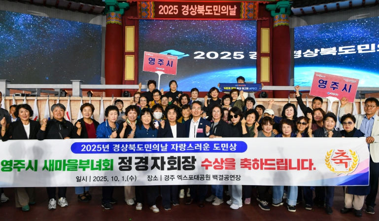 [무한뉴스=최진수 기자] 영주시는 10월 1일 경주 엑스포대공원 백결공연장에서 열린 ‘2025년 도민의 날 기념식’에서 정경자 영주시 새마을부녀회장이 ‘영주시 자랑스러운 도민상’을 수상했다고 밝혔다.