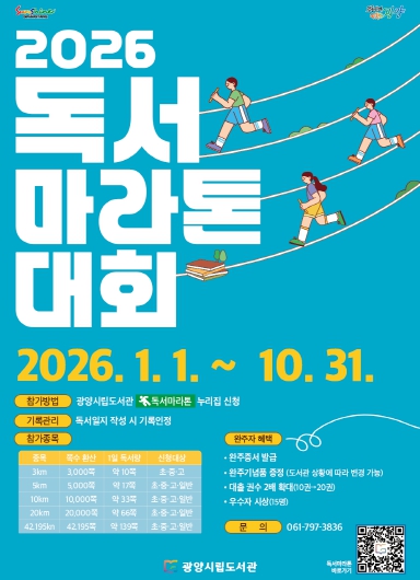 [무한뉴스=정민정 기자] 광양시립도서관이 지역사회에 독서문화 확산을 위해 2026년 1월 1일부터 10월 31일까지 ‘2026 광양시 독서마라톤 대회’를 운영한다.