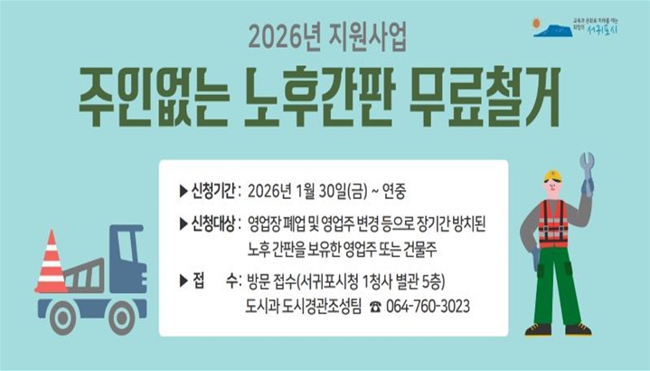 [무한뉴스=정민정 기자] 서귀포시는 안전하고 쾌적한 도시경관 조성 및 소상공인의 경영 안정을 도모하기 위해 30일부터 ‘2026년 주인없는 노후간판 무료철거 지원사업’ 대상자를 연중 모집한다.