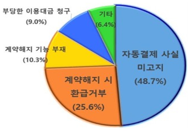 최근 헬스장 구독서비스 확산에 따라 자동결제‧해지 방해 등 새로운 유형의 피해도 급증하고 있는 것으로 나타났다. 실제로 관련 피해구제 신청 중 ‘자동결제 사실 미고지’가 48.7%(38건)로 가장 많았으며, 이어서 ‘계약해지 시 환급거부’ 25.6%(20건), ‘계약해지 기능 부재’ 10.3%(8건) 순으로 나타났다.