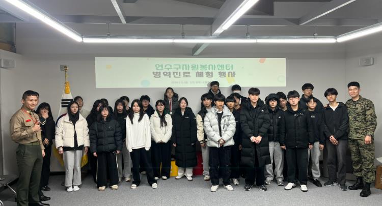 [무한뉴스=정승훈 기자] 연수구 자원봉사센터는 지난 1월 12일 겨울방학을 맞아 청소년 자원봉사자 30명을 대상으로 병역진로설계지원센터에서 병역직업체험 프로그램을 운영했다고 밝혔다.