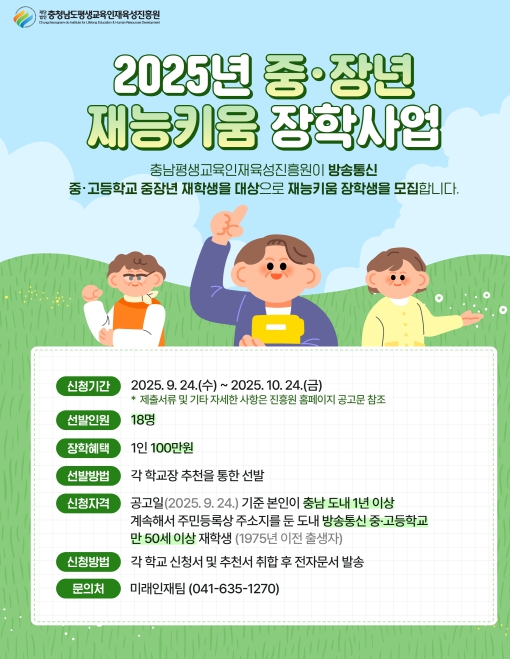 [무한뉴스=정민정 기자] 충청남도평생교육인재육성진흥원은 중장년층의 지속가능한 평생교육을 통해 학업 및 자기계발을 이루고, 나아가 인생 재설계를 지원 하기 위해 방송통신 중·고등학교 재학생을 대상으로 9월 24일부터 10월 24일까지 ‘2025년 중·장년 재능키움 장학생'을 모집한다.
