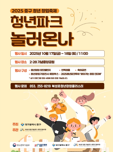 [무한뉴스=최진수 기자] 대구 중구는 청년창업가와 지역 주민이 함께 어울릴 수 있는 교류의 장을 마련하고자 2025년 중구 청년창업 축제 '청년파크 : 놀러온나'를 오는 10월 17일부터 18일까지 양일간 2·28기념중앙공원에서 개최한다고 밝혔다.