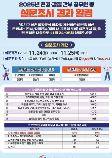 부산 공무원 노조는 11월 24일-25일 양일간‘일하고 싶은 직장문화 정착 및 개선방안 마련을 위한 존경하는 간부, 갑질간부(직장 내 괴롭힘 포함)설문조사 등’을 전 조합원 대상으로 실시했으며 약4,413명 중 2,458명 참여(55.7%) 6급 이하 부산시 공무원들이 이에 응했다.