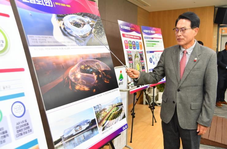 | ▲ 울산 울주군이 16일 군청 프레스센터에서 간절곶 식물원 건립사업에 대한 언론브리핑을 개최한 가운데 이순걸 울주군수가 사업 개요 및 향후 계획에 대해 설명하고 있다. |