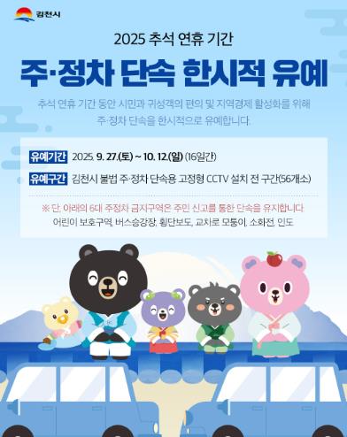 [무한뉴스=최진수 기자] 김천시는 9월 27일부터 10월 12일까지 16일간 추석 명절 기간 주정차 단속 카메라가 있는 전 구간(56개소)에 대하여, 단속 카메라를 통한 불법 주정차 단속을 유예한다.