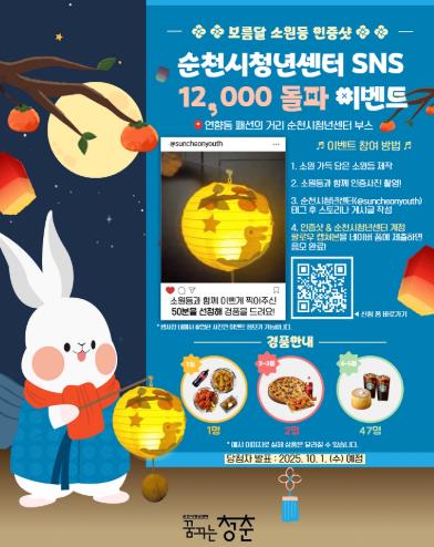 [무한뉴스=정민정 기자] 순천시 청년센터는 공식 SNS 가입자가 1만 2천 명을 돌파함에 따라 청년과 시민들의 성원에 보답하기 위해 기념 이벤트를 진행한다고 밝혔다.