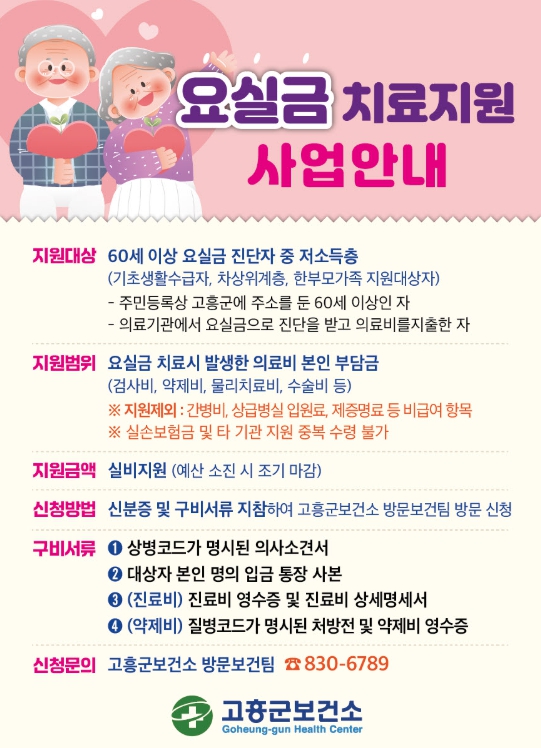 지원 대상은 고흥군에 주소를 둔 60세 이상 어르신 중 의료기관에서 요실금 진단을 받고 치료비를 지출한 ▲기초생활수급자 ▲차상위계층 ▲한부모가족 등 저소득층이다.