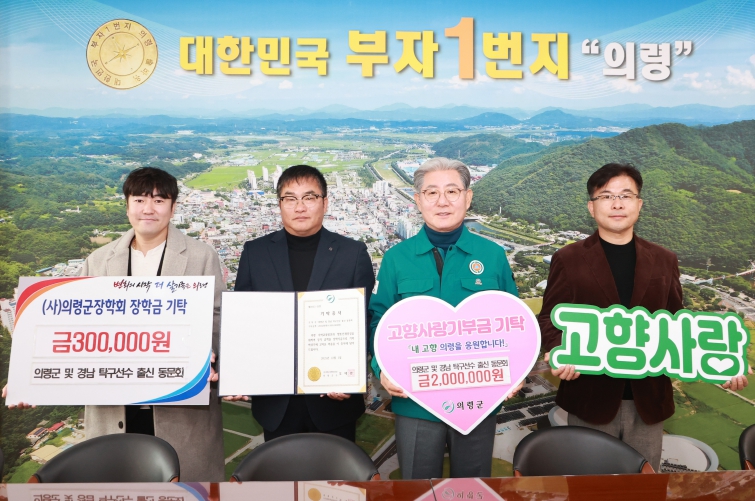 [무한뉴스=최진수 기자] 의령군은 지난 1일 의령군과 경남 지역 탁구선수 출신들로 구성된 동문회가 고향사랑기부금과 (사)의령군장학회 후원금으로 총 230만원을 기탁했다고 밝혔다.