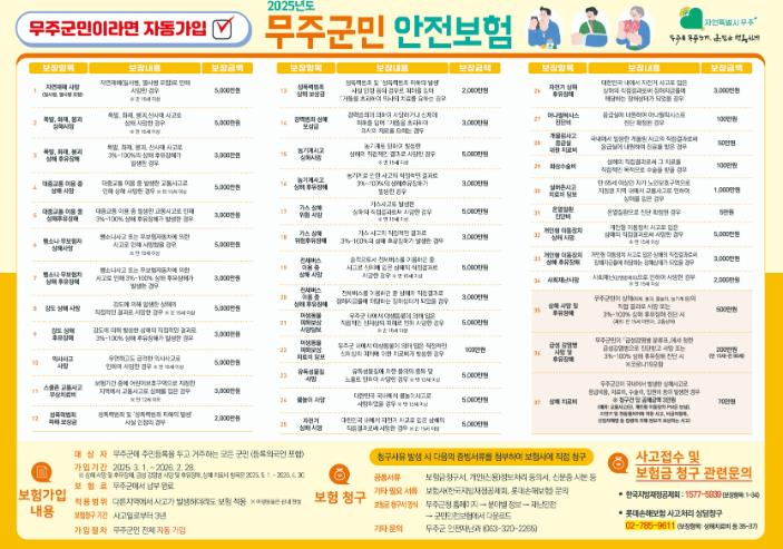 무주에 주소를 두고 거주 중인 무주군민(등록 외국인 포함)이라면 누구나 폭발·붕괴·화재로 인한 사망 및 후유장해를 비롯해 급성 감염병 사망 및 후유장애, 상해 치료비 등 총 37개 항목을 보장받을 수 있다.