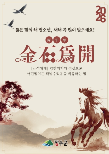 [무한뉴스=정민정 기자] 장수군은 2026년 병오년(丙午年) 새해를 맞아 군정 운영의 방향을 담은 신년 사자성어로 ‘금석위개(金石爲開)’를 선정했다.