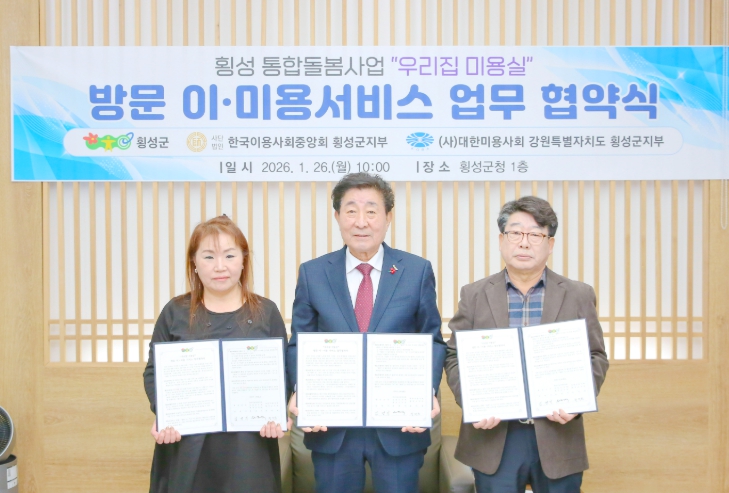 군은 26일, 한국이용사회중앙회 강원도지회 횡성군지부 및 대한미용사회 횡성군지부(지부장 정덕희)와 ‘방문 이·미용 서비스’ 제공을 위한 업무협약을 체결했다.