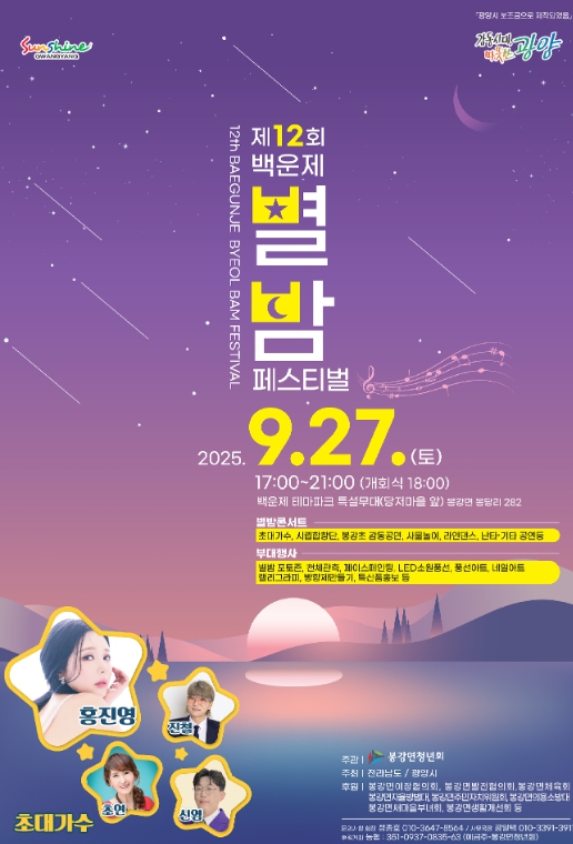 [무한뉴스=정민정 기자] 광양시 봉강면은 오는 9월 27일 오후 5시부터 밤 9시까지 봉강면 백운제 테마파크 특설무대(당저마을 앞)에서'제12회 백운제 별밤 페스티벌'을 개최한다고 밝혔다.