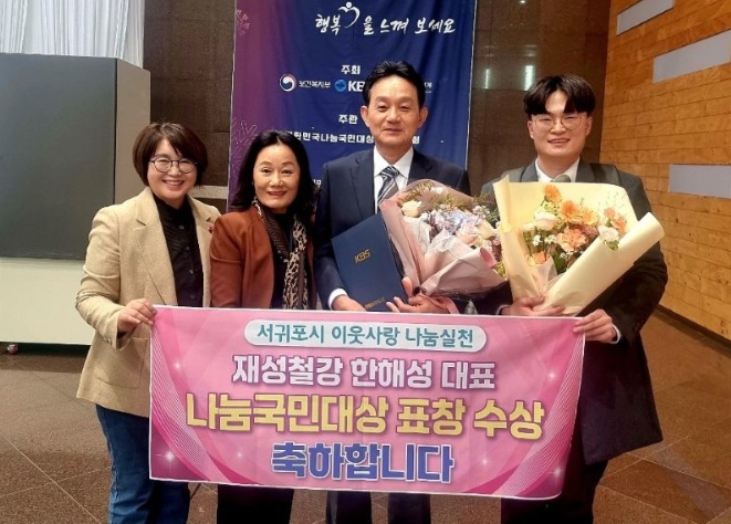 [무한뉴스=정민정 기자] 서귀포시는 재성철강 한해성 대표가 2014년부터 11년간 이웃사랑을 적극 실천해 온 공로를 인정받아 11월 6일 서울 KBS 본사에서 열린 ‘2025년 나눔국민대상 시상식’에서 민간단체장 대표수상자로 표창(KBS사장 표창)을 수상했다고 밝혔다.