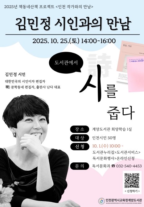 [무한뉴스=정승훈 기자] 인천광역시교육청계양도서관은 10월 25일 오후 2시 ‘책동네산책 프로젝트’의 일환으로 ‘김민정 시인과의 만남’을 개최한다.