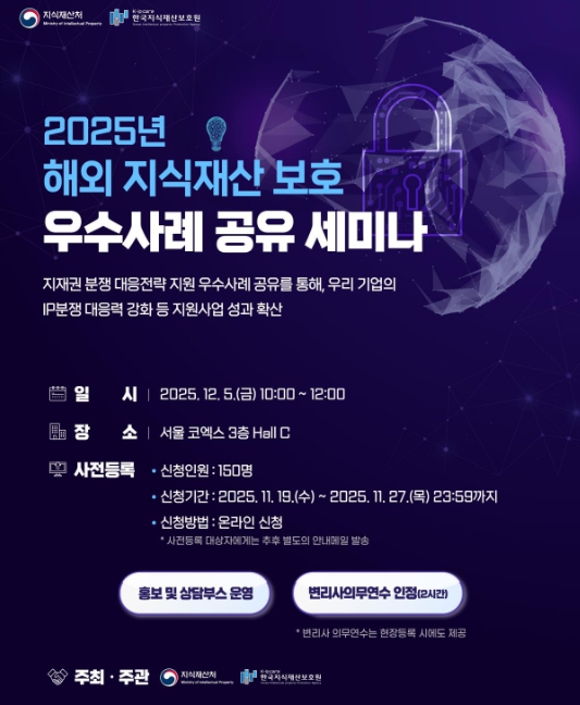 [무한뉴스=최진수 기자] 지식재산처는 12월 5일 10시 코엑스(서울시 강남구)에서 ‘2025년 해외 지식재산 보호 우수사례 공유 세미나’를 개최한다. 이번 행사는 2025 대한민국 지식재산대전의 일부 행사로 진행되며, 우리 기업이 해외 시장에서 자주 마주하는 지식재산 분쟁에 효과적으로 대응할 수 있게 실제 우수 사례와 대응 전략을 공유하는 자리로 마련됐다.