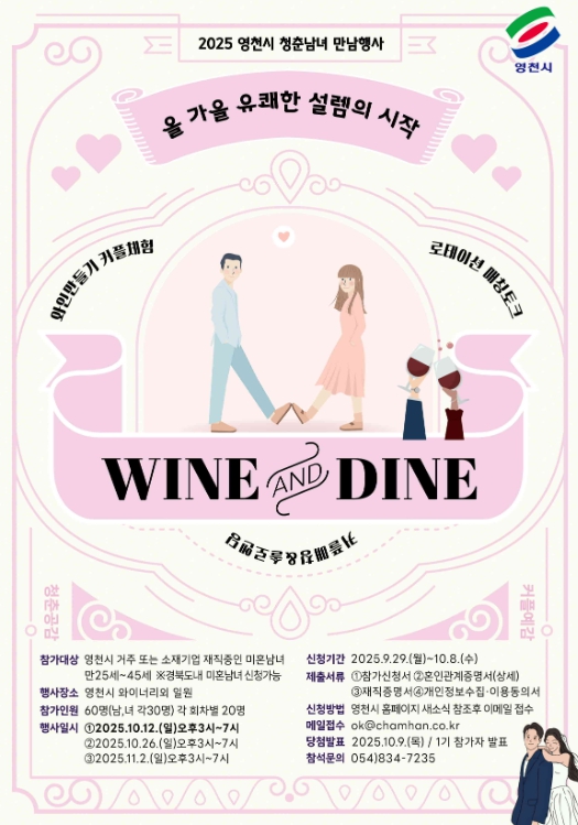 [무한뉴스=최진수 기자] 영천시는 오는 10월 12일, 10월 26일, 11월 2일 세 차례에 걸쳐 관내 와이너리에서 미혼남녀를 위한 특별한 만남 프로그램 ‘2025 영천愛 와인·다인(wine·dine)’을 개최한다.