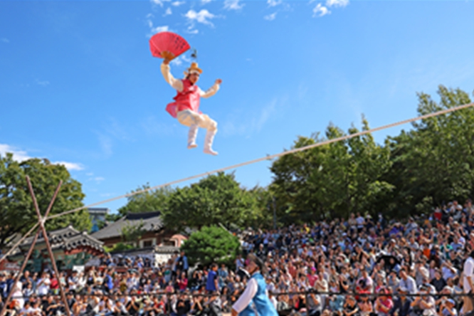 | ▲ 남산골한옥마을 줄타기 공연을 관람중인 시민들 |