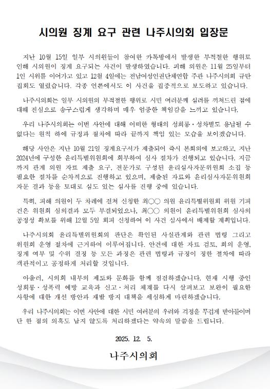 [무한뉴스=양현명 기자] 나주시의회는 지난 10월 15일 일부 시의원들이 참여한 카카오톡 대화방에서 발생한 부적절한 행위로 징계 요구가 제기되고, 피해 의원의 1인 시위와 여성단체 규탄 집회, 언론 보도가 이어진 상황과 관련하여 12월 5일 공식 입장문을 발표했다.