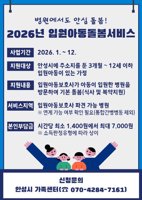 [무한뉴스=정충근 기자] 안성시는 아동이 입원한 병원에 입원아동보호사를 파견하는 입원아동돌봄서비스를 2026년에도 계속 운영하여 안정적인 돌봄 지원을 이어간다고 밝혔다.