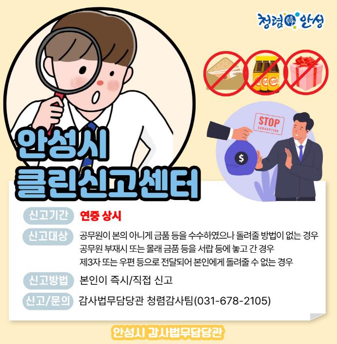 | ▲ "음료수 한 병도 정중히 거절합니다" 안성시, 청렴행정 구현을 위한 ‘클린신고센터’ 상시 운영 |
